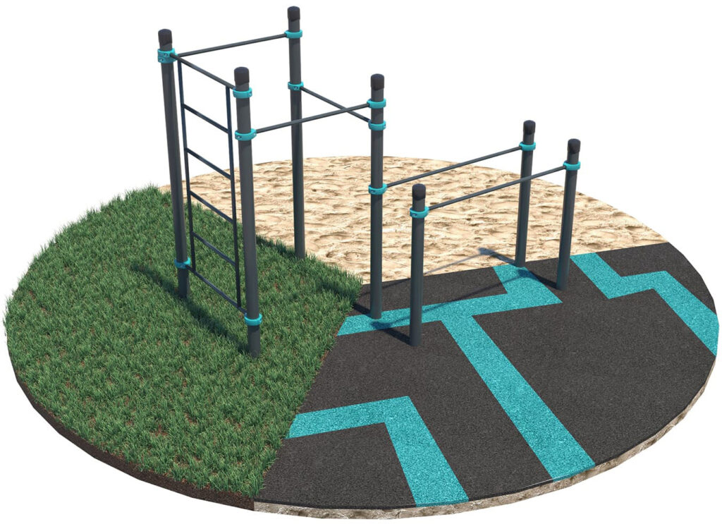 K-005- "Tiksi" O complexo comtém 7 colunas verticais de diferentes alturas e 3 barras de elevação com comprimento de 1200mm, uma Parede Sueca e uma conjunto de Barras Paralelas. A Parede Sueca consiste de barras com espaçamento de 407mm, com uma altura de 2073mm e largura de 1200mm. Nas Barras Paralelas o comprimento das mesmas é de 1758mm, e o espaçamento entre as colunas é de 600mm. Opcionalmente, duas barras de elevações deste complexo podem ser trocadas por barras com comprimento de 1758mm. O complexo é unido por braçadeiras de alumínio.